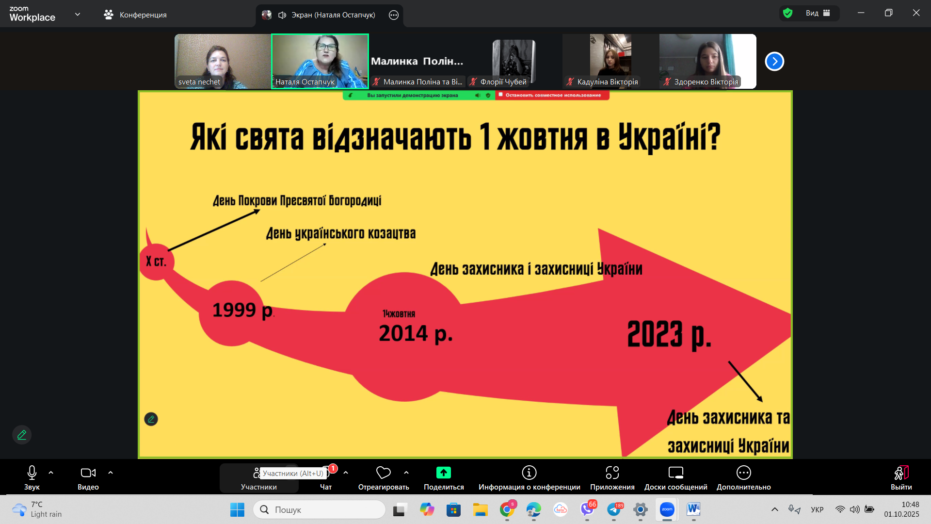 Під час зустрічі здобувачі та здобувачки освіти пригадали історію створення свята, дізналися більше про його зв'язок із Днем Покрови Пресвятої Богородиці та традиціями козацької доби. Учасники також обговорили події сучасної України та їх значення для формування національної свідомості. Важливою частиною заходу став перегляд та жваве обговорення відеофільму «Незламні», що глибше розкриває тему мужності та стійкості українських вояків.