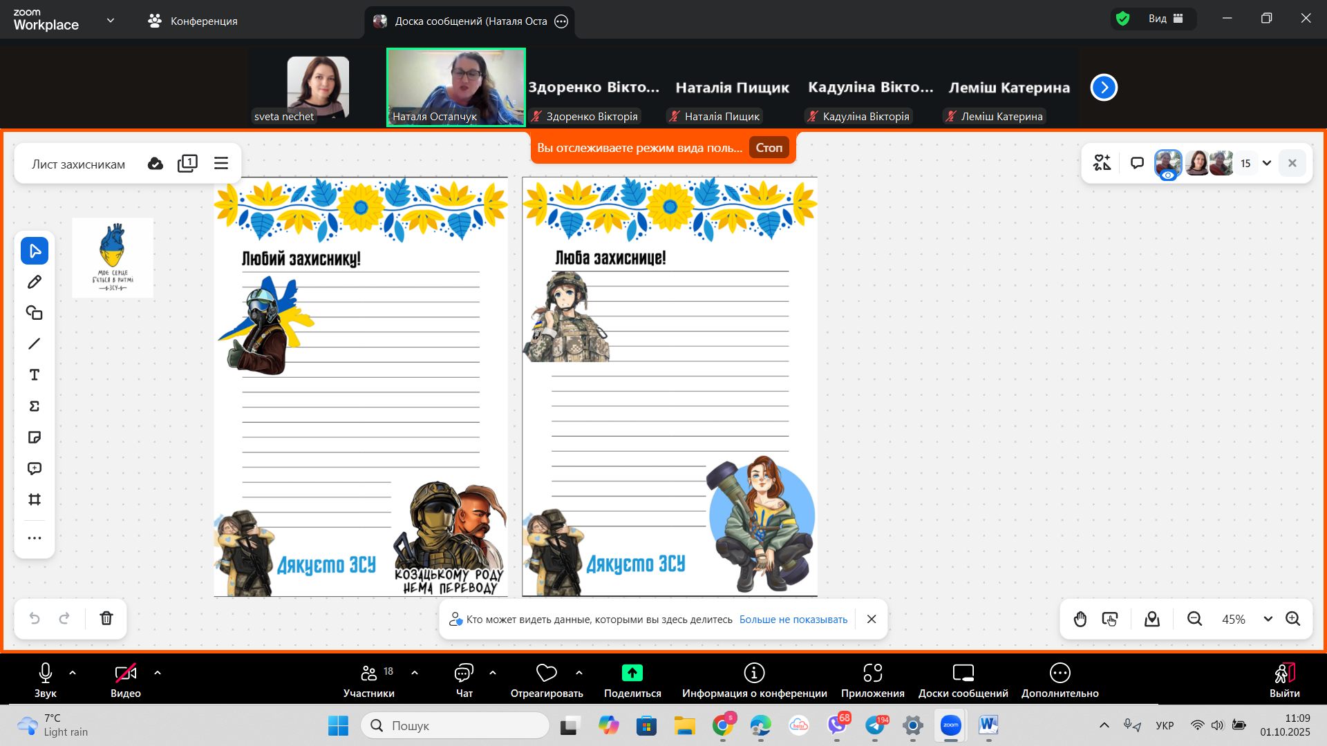 Щоб краще відчути єдність та вдячність, учасники виконували інтерактивні управи та спільно створили на віртуальній дошці Zoom «Лист захиснику і захисниці України». У цих теплих повідомленнях вони висловили щирі слова підтримки, благодарності та шанування всім, хто захищатиме Україну.